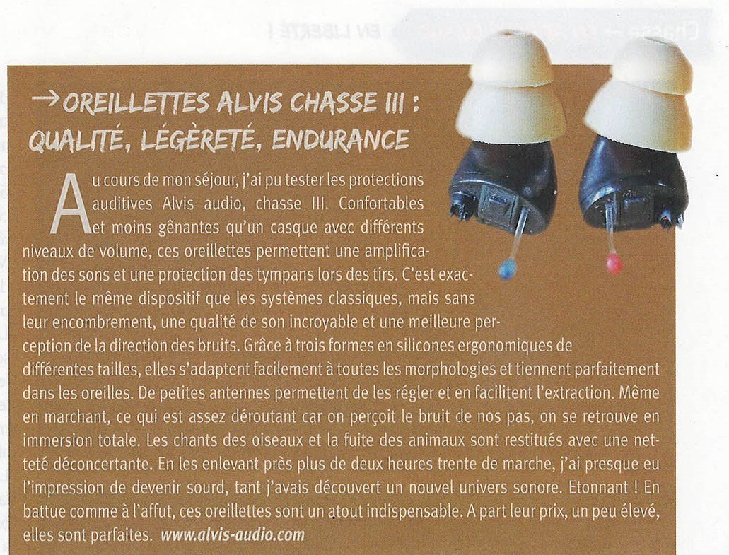 - Prog 1 : en plein calme pour une audition optimale et naturelle, - Prog 2 : chasse en forêt ou au poste, pour limiter les bruits parasites et optimiser la directionnalité, - Prog 3 : pour environnements bruits ou perturbés pour limiter la perception des bruits aux sons proches et utiles. Les oreillettes ALVIS Chasse III offrent une vraie perception à 360° et réduisent l'impact du vent.