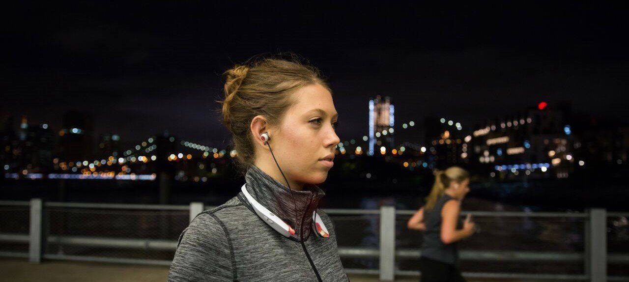 Oreillettes tour de cou pour le running. Munies de leds rouges à forte intensité, ces oreillettes vous permettent d'écouter l'extérieur tout en écoutant la musique (ou le téléphone) et en étant vu de loin grâce à son éclairage.